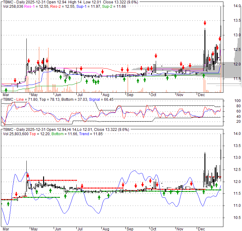 Price has closed above its short-term moving average. Short-term moving average is currently above mid-term; and above long-term moving average. From the relationship between price and moving averages: This stock is BULLISH in short-term; and BULLISH in mid-long term.[ TBMC ] has closed above the upper band by 25.9%. If price is in a uptrend band; this upward trend in price might continue. However a short term pullback inside the band is likely.Bollinger Bands are 334.1% wider than normal. The large width of the bands suggest high volatility as compared to its normal range. The bands have been in this wide range for 15 days. This is a sign that the current trend might continue.