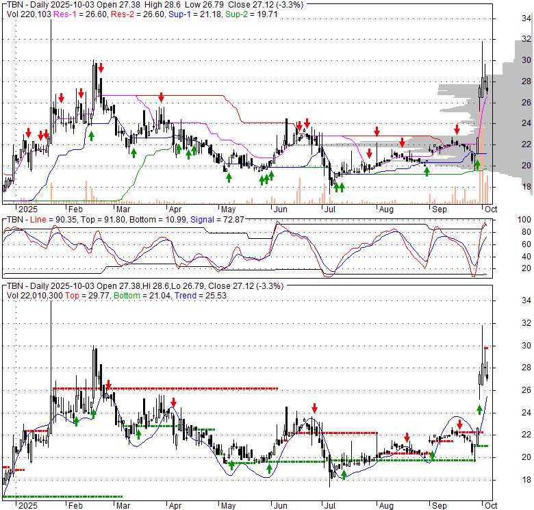 Price has closed above its short-term moving average. Short-term moving average is currently above mid-term; and above long-term moving average. From the relationship between price and moving averages: This stock is BULLISH in short-term; and BULLISH in mid-long term.[ TBN ] has closed below upper band by 15.1%. Bollinger Bands are 292.3% wider than normal. The large width of the bands suggest high volatility as compared to its normal range. The bands have been in this wide range for 3 days. This is a sign that the current trend might continue.