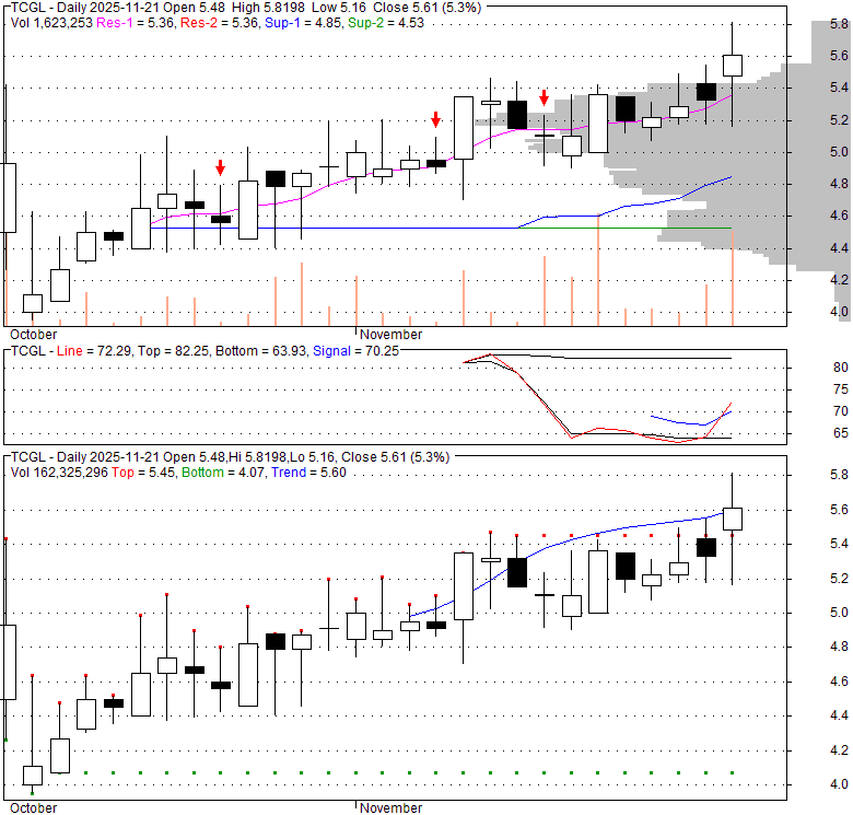 Price has closed above its short-term moving average. Short-term moving average is currently below mid-term; and below long-term moving average. From the relationship between price and moving averages: This stock is NEUTRAL in short-term; and NEUTRAL in mid-long term.[ TCGL ] has closed Bollinger Bands are 0% narrower than normal.