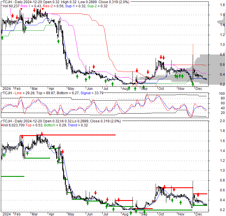 Price has closed above its short-term moving average. Short-term moving average is currently below mid-term; and below long-term moving average. From the relationship between price and moving averages: This stock is NEUTRAL in short-term; and NEUTRAL in mid-long term.[ TCJH ] has closed above bottom band by 21.1%. Bollinger Bands are 23.6% narrower than normal. The current width of the bands does not suggest anything about the future direction or movement of prices.