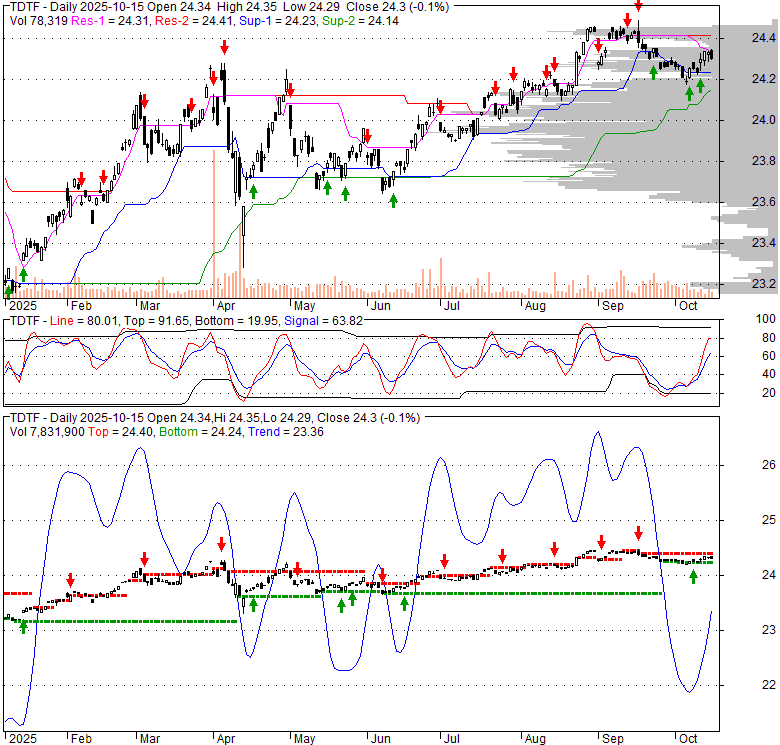 Price has closed above its short-term moving average. Short-term moving average is currently above mid-term; and above long-term moving average. From the relationship between price and moving averages: This stock is BULLISH in short-term; and BULLISH in mid-long term.[ TDTF ] has closed below upper band by 8.0%. Bollinger Bands are 38.9% narrower than normal. The current width of the bands does not suggest anything about the future direction or movement of prices.