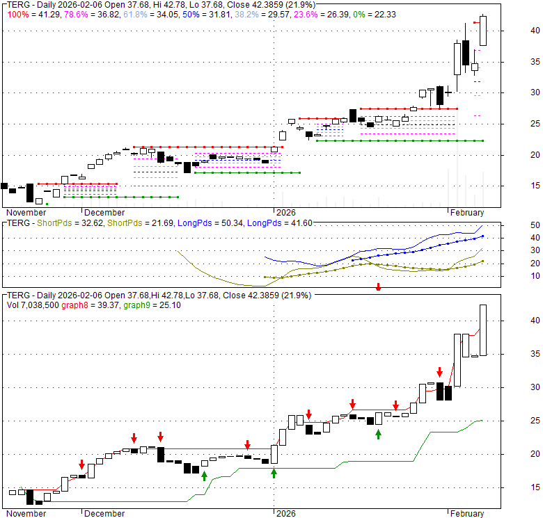 Price has closed above its short-term moving average. Short-term moving average is currently above mid-term; and below long-term moving average. From the relationship between price and moving averages: This stock is BULLISH in short-term; and NEUTRAL in mid-long term.[ TERG ] has closed above the upper band by 10.7%. If price is in a uptrend band; this upward trend in price might continue. However a short term pullback inside the band is likely.Bollinger Bands are 0% narrower than normal.