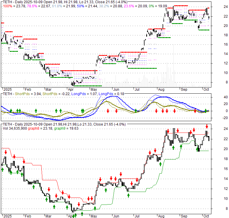 Price has closed below its short-term moving average. Short-term moving average is currently above mid-term; and above long-term moving average. From the relationship between price and moving averages: This stock is NEUTRAL in short-term; and BULLISH in mid-long term.[ TETH ] has closed below upper band by 48.8%. Bollinger Bands are 3.9% wider than normal. The current width of the bands does not suggest anything about the future direction or movement of prices.