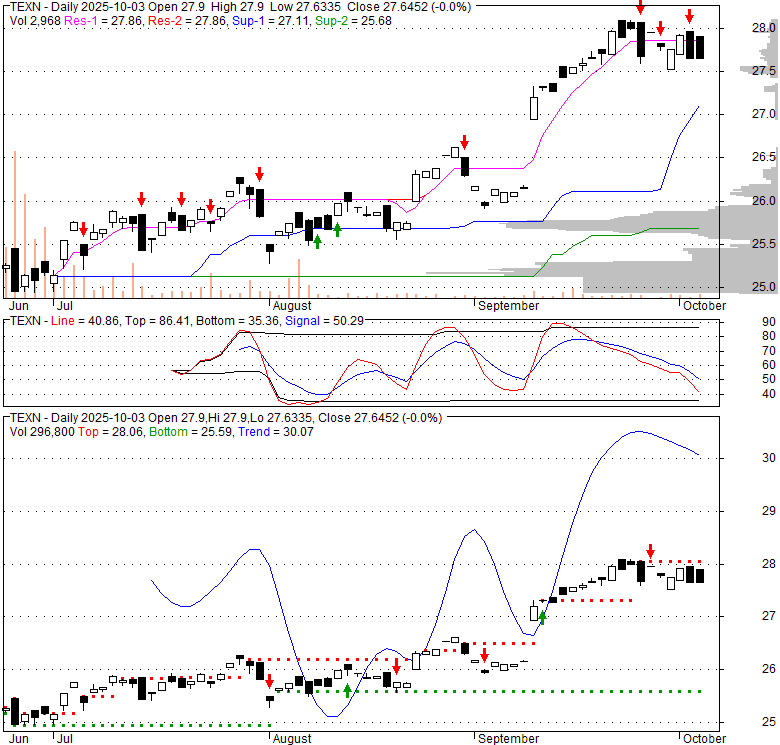 Price has closed below its short-term moving average. Short-term moving average is currently above mid-term; and below long-term moving average. From the relationship between price and moving averages: This stock is NEUTRAL in short-term; and NEUTRAL in mid-long term.[ TEXN ] has closed above bottom band by 34.7%. Bollinger Bands are 0% narrower than normal.