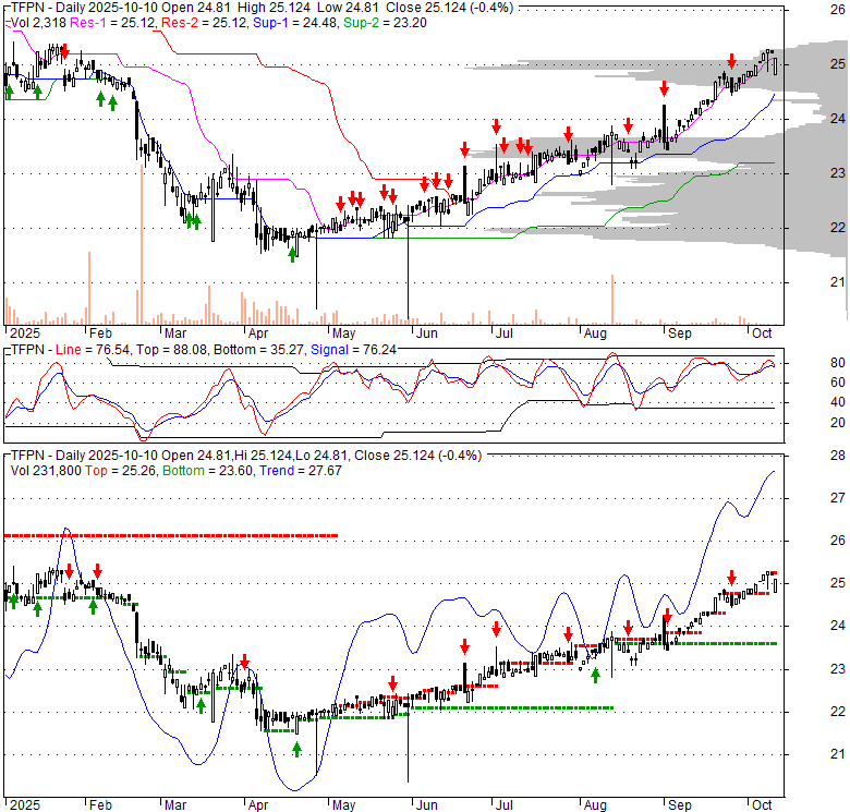 Price has closed below its short-term moving average. Short-term moving average is currently above mid-term; and above long-term moving average. From the relationship between price and moving averages: This stock is NEUTRAL in short-term; and BULLISH in mid-long term.[ TFPN ] has closed below upper band by 25.5%. Bollinger Bands are 29.2% wider than normal. The current width of the bands does not suggest anything about the future direction or movement of prices.