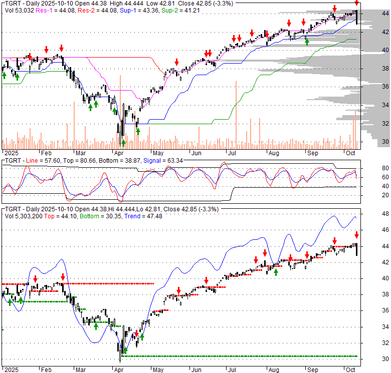 Price has closed below its short-term moving average. Short-term moving average is currently above mid-term; and above long-term moving average. From the relationship between price and moving averages: This stock is NEUTRAL in short-term; and BULLISH in mid-long term.[ TGRT ] has closed below the lower bollinger band by 4.4%. Although price has broken the lower band and a downside breakout is possible; the most likely direction for [ TGRT ] is to continue within current trading range. Bollinger Bands are 13.4% narrower than normal. The current width of the bands does not suggest anything about the future direction or movement of prices.