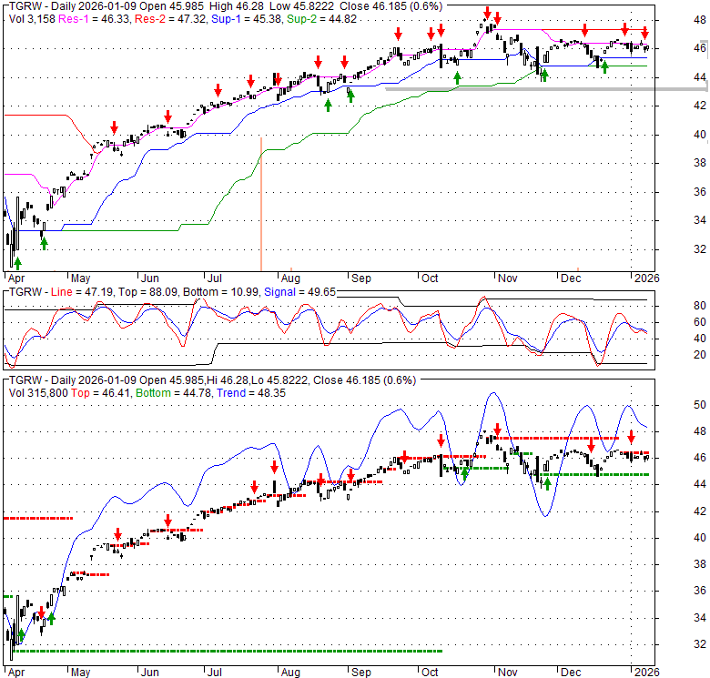 Price has closed above its short-term moving average. Short-term moving average is currently above mid-term; and above long-term moving average. From the relationship between price and moving averages: This stock is BULLISH in short-term; and BULLISH in mid-long term.[ TGRW ] has closed below upper band by 46.3%. Bollinger Bands are 42% narrower than normal. The narrow width of the bands suggests low volatility as compared to its normal range. The bands have been in this narrow range for 0 bars. This is a sign that the market may be about to initiate a new trend.