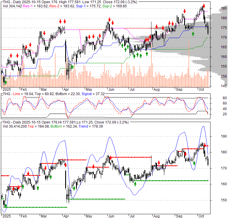 Price has closed below its short-term moving average. Short-term moving average is currently below mid-term; and above long-term moving average. From the relationship between price and moving averages: This stock is BEARISH in short-term; and NEUTRAL in mid-long term.[ THG ] has closed below the lower bollinger band by 4.9%. Although price has broken the lower band and a downside breakout is possible; the most likely direction for [ THG ] is to continue within current trading range. Bollinger Bands are 37.5% wider than normal. The current width of the bands does not suggest anything about the future direction or movement of prices.