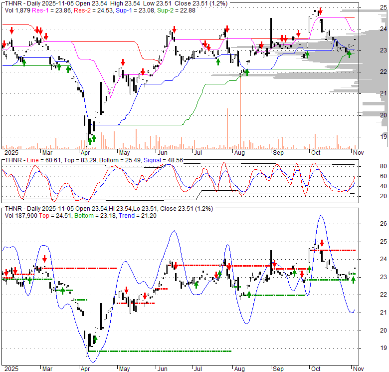 Price has closed above its short-term moving average. Short-term moving average is currently below mid-term; and above long-term moving average. From the relationship between price and moving averages: This stock is NEUTRAL in short-term; and NEUTRAL in mid-long term.[ THNR ] has closed below upper band by 23.7%. Bollinger Bands are 44.5% narrower than normal. The narrow width of the bands suggests low volatility as compared to its normal range. The bands have been in this narrow range for 0 bars. This is a sign that the market may be about to initiate a new trend.