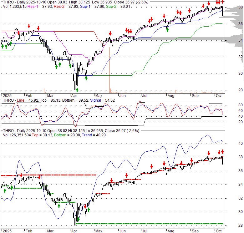 Price has closed below its short-term moving average. Short-term moving average is currently above mid-term; and above long-term moving average. From the relationship between price and moving averages: This stock is NEUTRAL in short-term; and BULLISH in mid-long term.[ THRO ] has closed below the lower bollinger band by 22.7%. If price is in a downtrend band; this downward trend might continue. However a short term pullback inside the band is likely. Bollinger Bands are 13.5% narrower than normal. The current width of the bands does not suggest anything about the future direction or movement of prices.