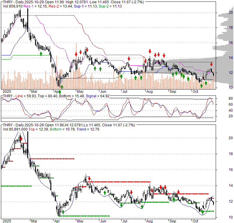Price has closed below its short-term moving average. Short-term moving average is currently below mid-term; and below long-term moving average. From the relationship between price and moving averages: This stock is BEARISH in short-term; and BEARISH in mid-long term.[ THRY ] has closed below the lower bollinger band by 20.1%. Although price has broken the lower band and a downside breakout is possible; the most likely direction for [ THRY ] is to continue within current trading range. It is unclear right now based on current values. 85.1% wider than normal. The large width of the bands suggest high volatility as compared to its normal range. The bands have been in this wide range for 0 days. This is a sign that the current trend might continue.