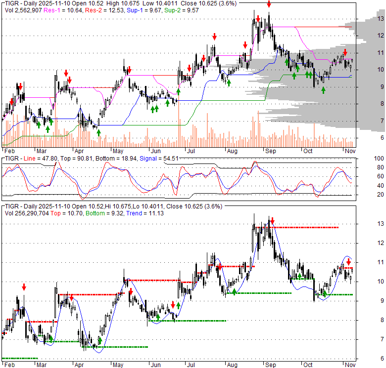 Price has closed above its short-term moving average. Short-term moving average is currently above mid-term; and below long-term moving average. From the relationship between price and moving averages: This stock is BULLISH in short-term; and NEUTRAL in mid-long term.[ TIGR ] has closed below upper band by 44.3%. Bollinger Bands are 44.7% narrower than normal. The narrow width of the bands suggests low volatility as compared to its normal range. The bands have been in this narrow range for 0 bars. This is a sign that the market may be about to initiate a new trend.