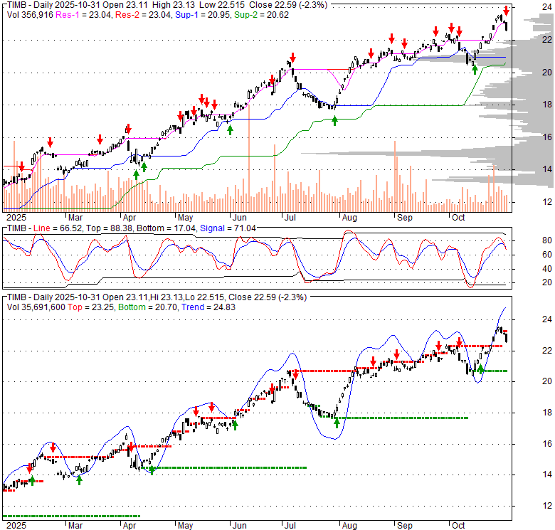 Price has closed below its short-term moving average. Short-term moving average is currently above mid-term; and above long-term moving average. From the relationship between price and moving averages: This stock is NEUTRAL in short-term; and BULLISH in mid-long term.[ TIMB ] has closed below upper band by 38.0%. Bollinger Bands are 58.1% wider than normal. The large width of the bands suggest high volatility as compared to its normal range. The bands have been in this wide range for 3 days. This is a sign that the current trend might continue.
