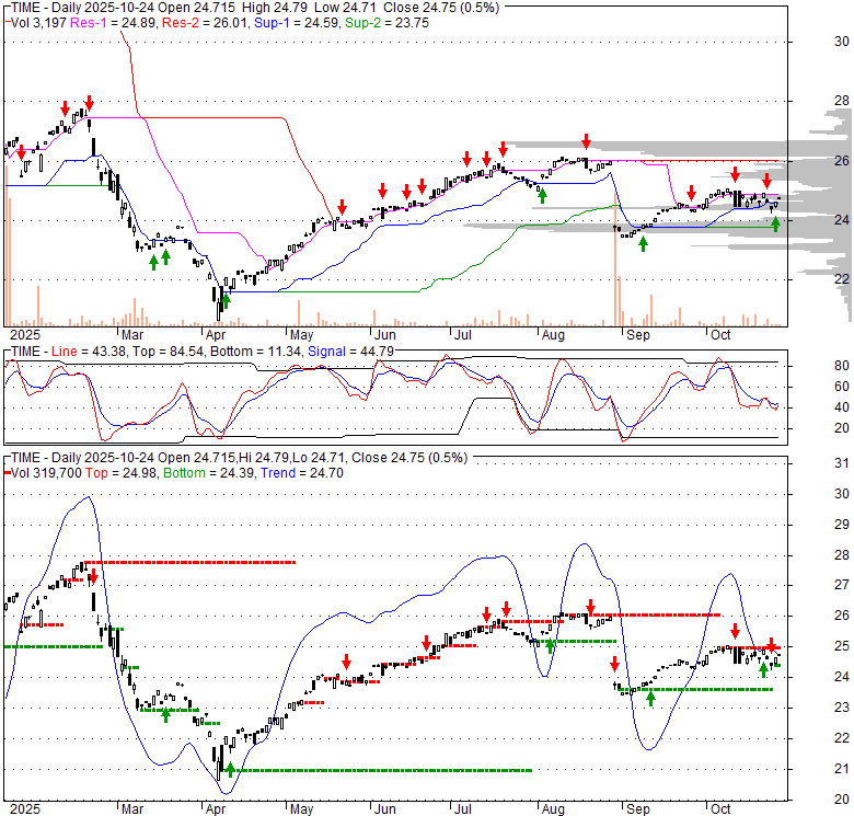 Price has closed above its short-term moving average. Short-term moving average is currently above mid-term; and below long-term moving average. From the relationship between price and moving averages: This stock is BULLISH in short-term; and NEUTRAL in mid-long term.[ TIME ] has closed below upper band by 43.9%. Bollinger Bands are 46% narrower than normal. The narrow width of the bands suggests low volatility as compared to its normal range. The bands have been in this narrow range for 6 bars. This is a sign that the market may be about to initiate a new trend.