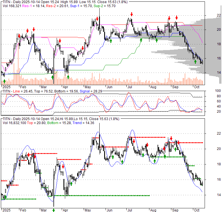 Price has closed below its short-term moving average. Short-term moving average is currently below mid-term; and below long-term moving average. From the relationship between price and moving averages: This stock is BEARISH in short-term; and BEARISH in mid-long term.[ TITN ] has closed above bottom band by 20.0%. Bollinger Bands are 15.5% narrower than normal. The current width of the bands does not suggest anything about the future direction or movement of prices.