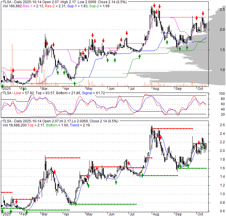 Price has closed below its short-term moving average. Short-term moving average is currently above mid-term; and above long-term moving average. From the relationship between price and moving averages: This stock is NEUTRAL in short-term; and BULLISH in mid-long term.[ TLSA ] has closed below upper band by 33.6%. Bollinger Bands are 29.8% narrower than normal. The current width of the bands does not suggest anything about the future direction or movement of prices.