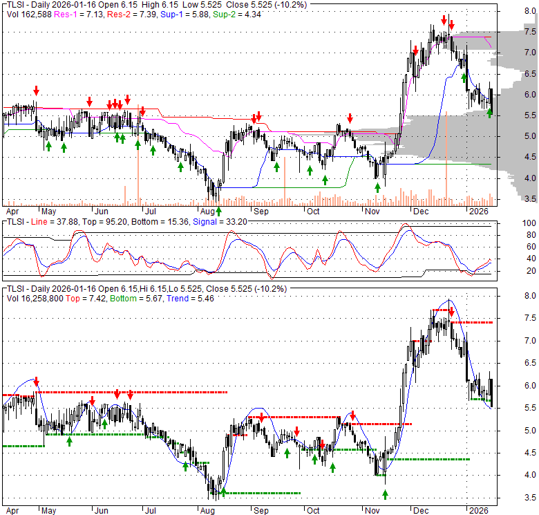 Price has closed below its short-term moving average. Short-term moving average is currently below mid-term; and above long-term moving average. From the relationship between price and moving averages: This stock is BEARISH in short-term; and NEUTRAL in mid-long term.[ TLSI ] has closed above bottom band by 11.6%. Bollinger Bands are 21.7% wider than normal. The current width of the bands does not suggest anything about the future direction or movement of prices.