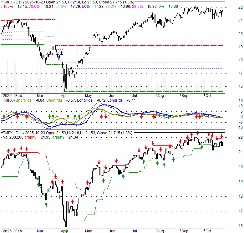 Price has closed above its short-term moving average. Short-term moving average is currently below mid-term; and above long-term moving average. From the relationship between price and moving averages: This stock is NEUTRAL in short-term; and NEUTRAL in mid-long term.[ TMFX ] has closed below upper band by 39.2%. Bollinger Bands are 6.1% narrower than normal. The current width of the bands does not suggest anything about the future direction or movement of prices.