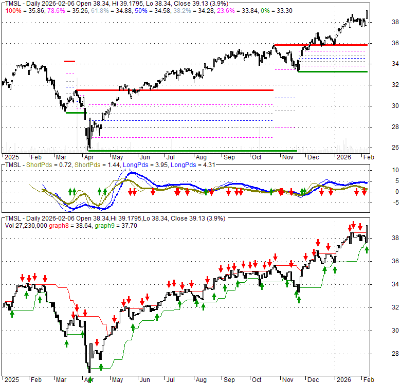Price has closed above its short-term moving average. Short-term moving average is currently above mid-term; and above long-term moving average. From the relationship between price and moving averages: This stock is BULLISH in short-term; and BULLISH in mid-long term.[ TMSL ] has closed above the upper band by 14.5%. If price is in a uptrend band; this upward trend in price might continue. However a short term pullback inside the band is likely.Bollinger Bands are 13.1% narrower than normal. The current width of the bands does not suggest anything about the future direction or movement of prices.