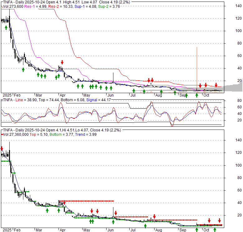 Price has closed above its short-term moving average. Short-term moving average is currently below mid-term; and below long-term moving average. From the relationship between price and moving averages: This stock is NEUTRAL in short-term; and BEARISH in mid-long term.[ TNFA ] has closed above bottom band by 42.9%. Bollinger Bands are 60% narrower than normal. The narrow width of the bands suggests low volatility as compared to its normal range. The bands have been in this narrow range for 26 bars. This is a sign that the market may be about to initiate a new trend.