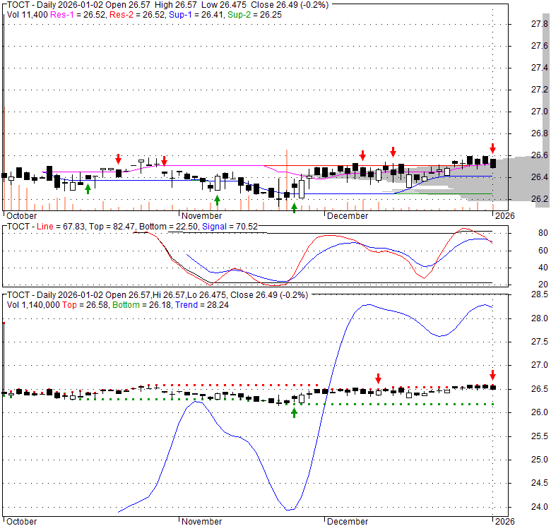 Price has closed below its short-term moving average. Short-term moving average is currently above mid-term; and below long-term moving average. From the relationship between price and moving averages: This stock is NEUTRAL in short-term; and NEUTRAL in mid-long term.[ TOCT ] has closed below upper band by 40.1%. Bollinger Bands are 0% narrower than normal.