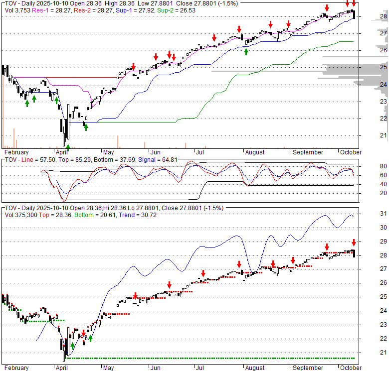 Price has closed below its short-term moving average. Short-term moving average is currently above mid-term; and above long-term moving average. From the relationship between price and moving averages: This stock is NEUTRAL in short-term; and BULLISH in mid-long term.[ TOV ] has closed above bottom band by 15.0%. Bollinger Bands are 33.3% narrower than normal. The current width of the bands does not suggest anything about the future direction or movement of prices.
