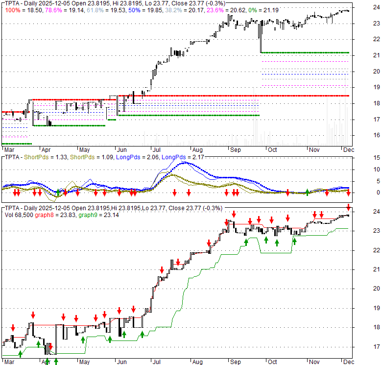 Price has closed below its short-term moving average. Short-term moving average is currently above mid-term; and above long-term moving average. From the relationship between price and moving averages: This stock is NEUTRAL in short-term; and BULLISH in mid-long term.[ TPTA ] has closed below upper band by 27.9%. Bollinger Bands are 34.7% narrower than normal. The current width of the bands does not suggest anything about the future direction or movement of prices.
