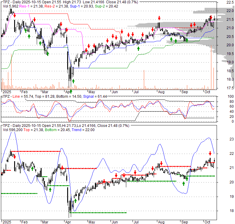 Price has closed above its short-term moving average. Short-term moving average is currently above mid-term; and above long-term moving average. From the relationship between price and moving averages: This stock is BULLISH in short-term; and BULLISH in mid-long term.[ TPZ ] has closed below upper band by 0.2%. Bollinger Bands are 22.6% wider than normal. The current width of the bands does not suggest anything about the future direction or movement of prices.
