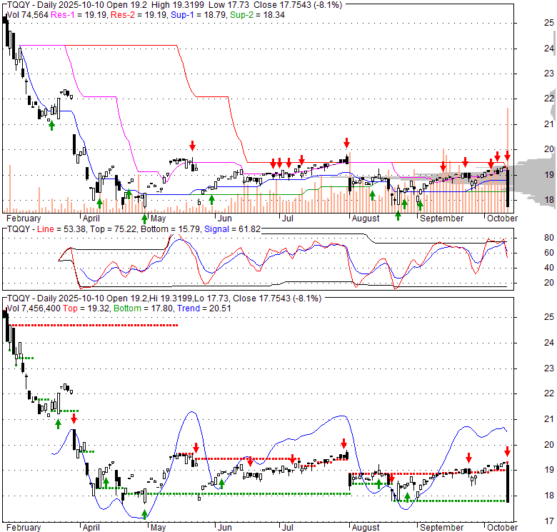 Price has closed below its short-term moving average. Short-term moving average is currently above mid-term; and above long-term moving average. From the relationship between price and moving averages: This stock is NEUTRAL in short-term; and NEUTRAL in mid-long term.[ TQQY ] has closed below the lower bollinger band by 29.0%. Bollinger Bands are 18.2% wider than normal. The current width of the bands does not suggest anything about the future direction or movement of prices.