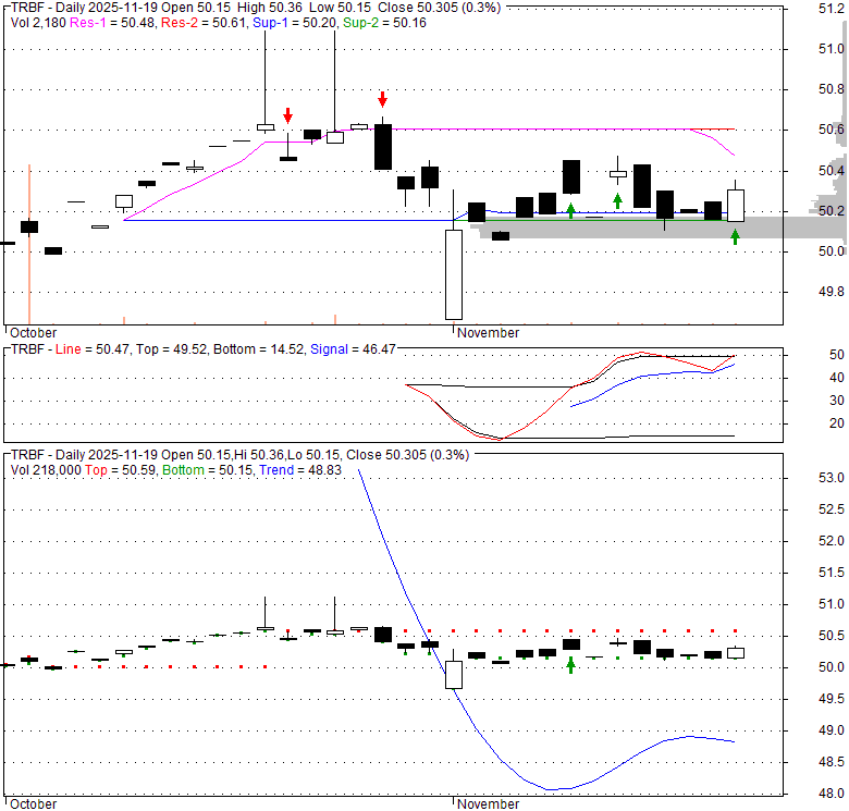 Price has closed above its short-term moving average. Short-term moving average is currently below mid-term; and below long-term moving average. From the relationship between price and moving averages: This stock is NEUTRAL in short-term; and NEUTRAL in mid-long term.[ TRBF ] has closed below upper band by 24.4%. Bollinger Bands are 0% narrower than normal.