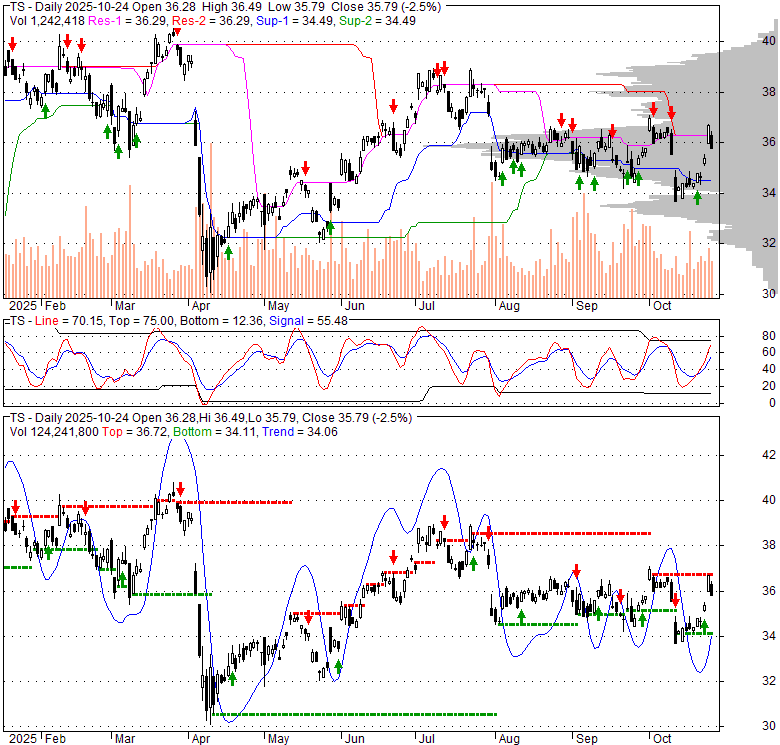 Price has closed above its short-term moving average. Short-term moving average is currently below mid-term; and below long-term moving average. From the relationship between price and moving averages: This stock is NEUTRAL in short-term; and BEARISH in mid-long term.[ TS ] has closed below upper band by 32.7%. Bollinger Bands are 19% wider than normal. The current width of the bands does not suggest anything about the future direction or movement of prices.
