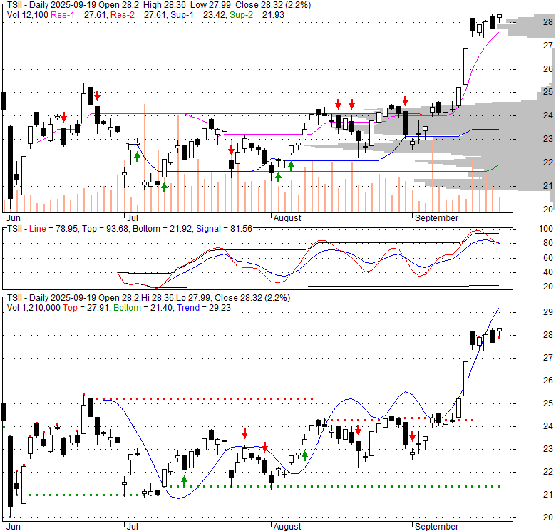 Price has closed below its short-term moving average. Short-term moving average is currently above mid-term; and below long-term moving average. From the relationship between price and moving averages: This stock is NEUTRAL in short-term; and NEUTRAL in mid-long term.[ TSII ] has closed above bottom band by 45.3%. Bollinger Bands are 0% narrower than normal.