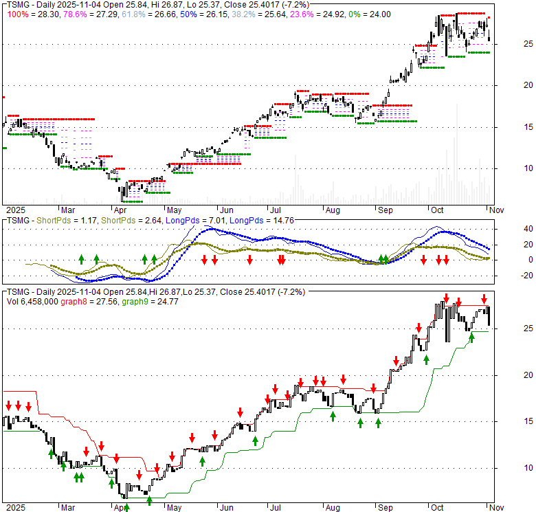 Price has closed below its short-term moving average. Short-term moving average is currently above mid-term; and above long-term moving average. From the relationship between price and moving averages: This stock is NEUTRAL in short-term; and BULLISH in mid-long term.[ TSMG ] has closed above bottom band by 23.7%. Bollinger Bands are 21.3% narrower than normal. The current width of the bands does not suggest anything about the future direction or movement of prices.