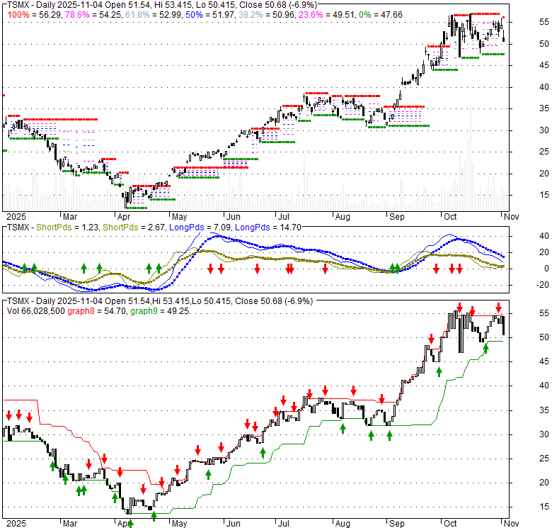 Price has closed below its short-term moving average. Short-term moving average is currently above mid-term; and above long-term moving average. From the relationship between price and moving averages: This stock is NEUTRAL in short-term; and BULLISH in mid-long term.[ TSMX ] has closed above bottom band by 24.0%. Bollinger Bands are 18.5% narrower than normal. The current width of the bands does not suggest anything about the future direction or movement of prices.