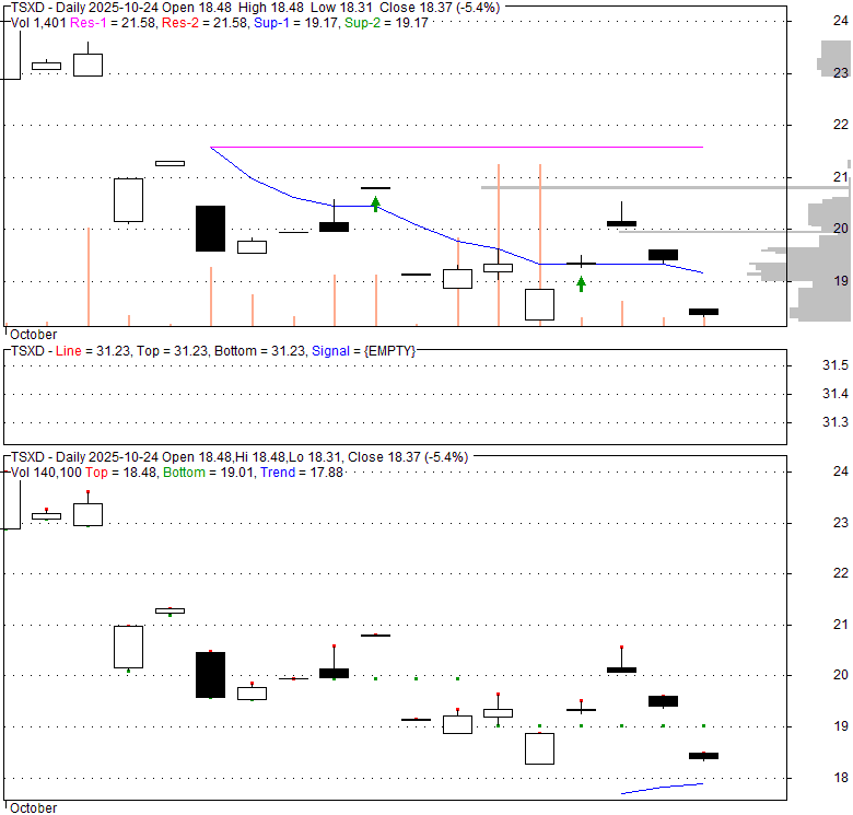 Price has closed below its short-term moving average. Short-term moving average is currently below mid-term; and below long-term moving average. From the relationship between price and moving averages: This stock is NEUTRAL in short-term; and NEUTRAL in mid-long term.[ TSXD ] has closed above bottom band by 5.8%. Bollinger Bands are 0% narrower than normal.