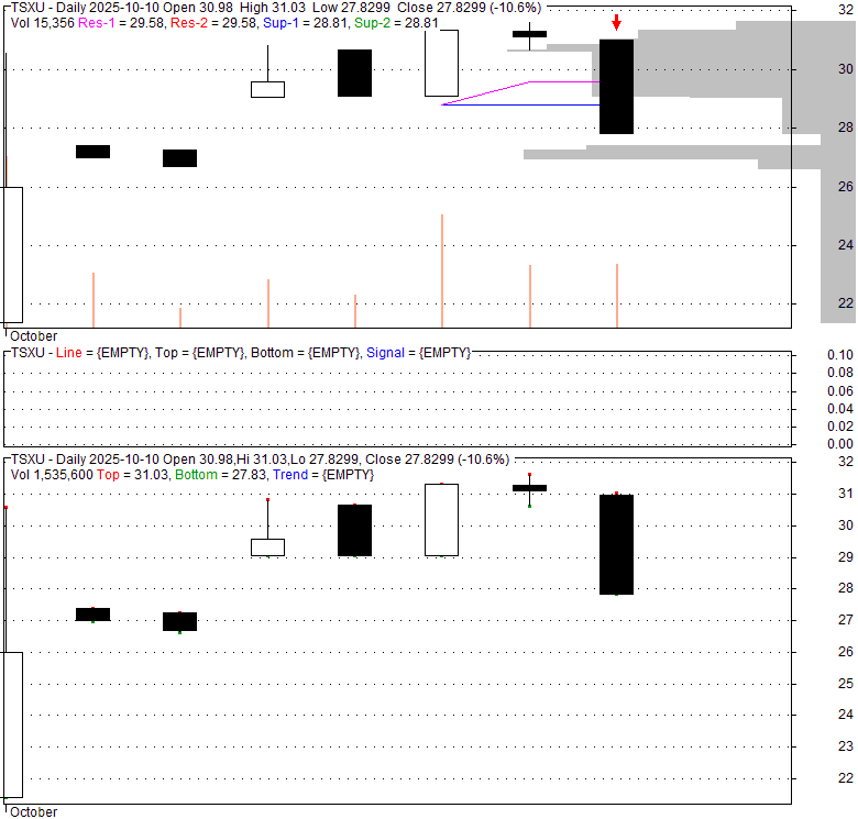 Price has closed below its short-term moving average. Short-term moving average is currently below mid-term; and below long-term moving average. From the relationship between price and moving averages: This stock is NEUTRAL in short-term; and NEUTRAL in mid-long term.[ TSXU ] has closed Bollinger Bands are 0% narrower than normal.