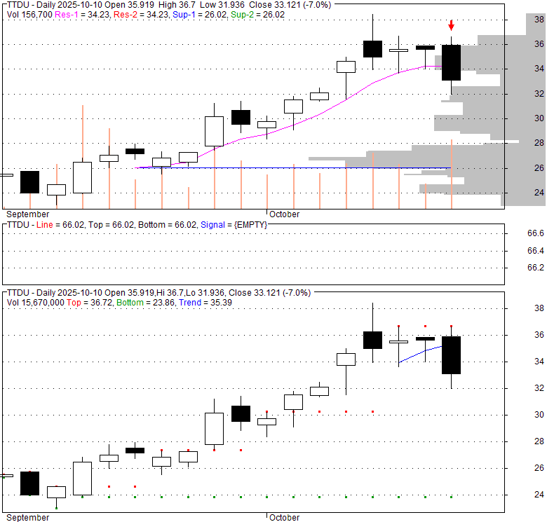Price has closed below its short-term moving average. Short-term moving average is currently below mid-term; and below long-term moving average. From the relationship between price and moving averages: This stock is NEUTRAL in short-term; and NEUTRAL in mid-long term.[ TTDU ] has closed below upper band by 32.4%. Bollinger Bands are 0% narrower than normal.