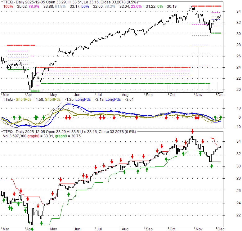 Price has closed above its short-term moving average. Short-term moving average is currently above mid-term; and above long-term moving average. From the relationship between price and moving averages: This stock is BULLISH in short-term; and BULLISH in mid-long term.[ TTEQ ] has closed below upper band by 16.8%. Bollinger Bands are 50% wider than normal. The large width of the bands suggest high volatility as compared to its normal range. The bands have been in this wide range for 27 days. This is a sign that the current trend might continue.