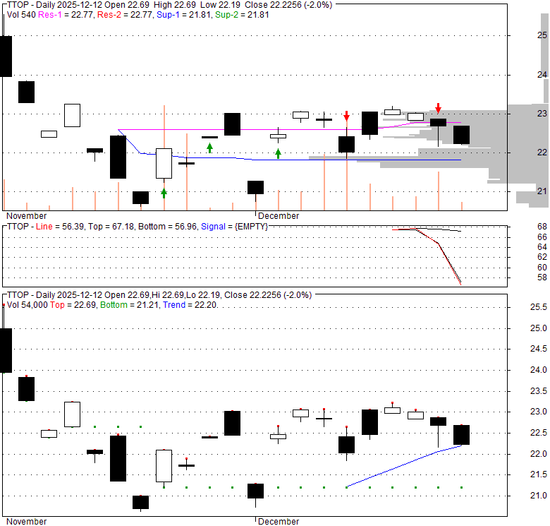 Price has closed below its short-term moving average. Short-term moving average is currently below mid-term; and below long-term moving average. From the relationship between price and moving averages: This stock is NEUTRAL in short-term; and NEUTRAL in mid-long term.[ TTOP ] has closed above bottom band by 48.1%. Bollinger Bands are 0% narrower than normal.