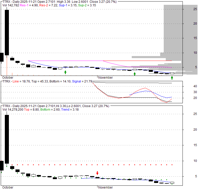 Price has closed above its short-term moving average. Short-term moving average is currently below mid-term; and below long-term moving average. From the relationship between price and moving averages: This stock is NEUTRAL in short-term; and NEUTRAL in mid-long term.[ TTRX ] has closed above bottom band by 26.6%. Bollinger Bands are 0% narrower than normal.