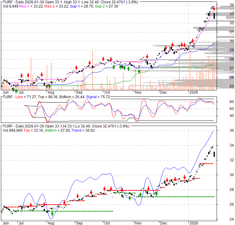 Price has closed below its short-term moving average. Short-term moving average is currently above mid-term; and above long-term moving average. From the relationship between price and moving averages: This stock is NEUTRAL in short-term; and BULLISH in mid-long term.[ TURF ] has closed below upper band by 38.9%. Bollinger Bands are 173.9% wider than normal. The large width of the bands suggest high volatility as compared to its normal range. The bands have been in this wide range for 12 days. This is a sign that the current trend might continue.