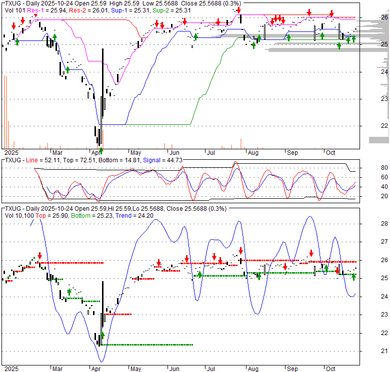 Price has closed above its short-term moving average. Short-term moving average is currently below mid-term; and below long-term moving average. From the relationship between price and moving averages: This stock is NEUTRAL in short-term; and NEUTRAL in mid-long term.[ TXUG ] has closed below upper band by 43.6%. Bollinger Bands are 27.1% wider than normal. The current width of the bands does not suggest anything about the future direction or movement of prices.
