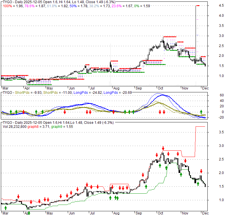 Price has closed below its short-term moving average. Short-term moving average is currently below mid-term; and below long-term moving average. From the relationship between price and moving averages: This stock is BEARISH in short-term; and NEUTRAL in mid-long term.[ TYGO ] has closed above bottom band by 20.6%. Bollinger Bands are 19.2% narrower than normal. The current width of the bands does not suggest anything about the future direction or movement of prices.