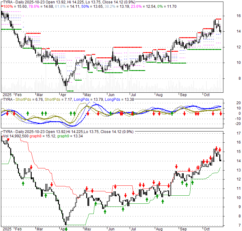 Price has closed below its short-term moving average. Short-term moving average is currently above mid-term; and above long-term moving average. From the relationship between price and moving averages: This stock is NEUTRAL in short-term; and BULLISH in mid-long term.[ TYRA ] has closed below upper band by 48.2%. Bollinger Bands are 23.8% wider than normal. The current width of the bands does not suggest anything about the future direction or movement of prices.