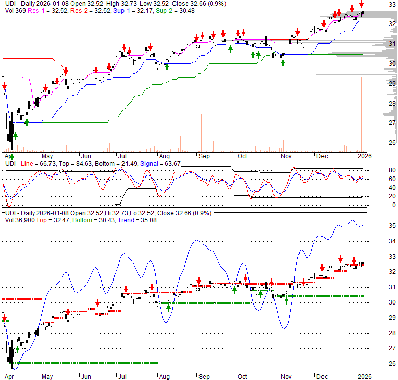 Price has closed above its short-term moving average. Short-term moving average is currently above mid-term; and above long-term moving average. From the relationship between price and moving averages: This stock is BULLISH in short-term; and BULLISH in mid-long term.[ UDI ] has closed below upper band by 5.1%. Bollinger Bands are 37.7% narrower than normal. The current width of the bands does not suggest anything about the future direction or movement of prices.
