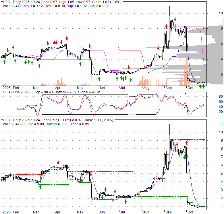 Price has closed above its short-term moving average. Short-term moving average is currently below mid-term; and below long-term moving average. From the relationship between price and moving averages: This stock is NEUTRAL in short-term; and NEUTRAL in mid-long term.[ UFG ] has closed above bottom band by 45.7%. Bollinger Bands are 87.7% narrower than normal. The narrow width of the bands suggests low volatility as compared to its normal range. The bands have been in this narrow range for 2 bars. This is a sign that the market may be about to initiate a new trend.