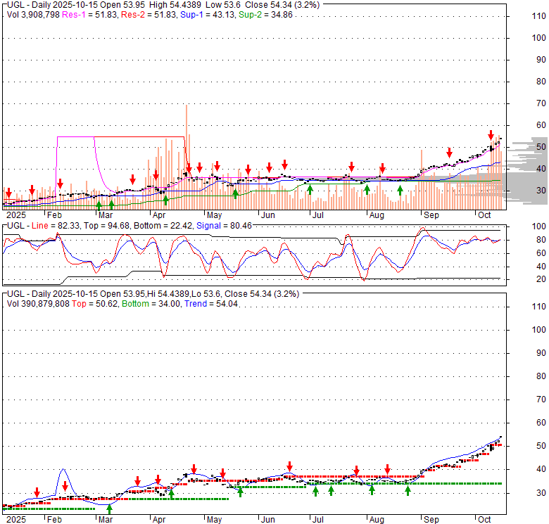 Price has closed above its short-term moving average. Short-term moving average is currently above mid-term; and above long-term moving average. From the relationship between price and moving averages: This stock is BULLISH in short-term; and BULLISH in mid-long term.[ UGL ] has closed below upper band by 2.0%. Bollinger Bands are 164.2% wider than normal. The large width of the bands suggest high volatility as compared to its normal range. The bands have been in this wide range for 11 days. This is a sign that the current trend might continue.