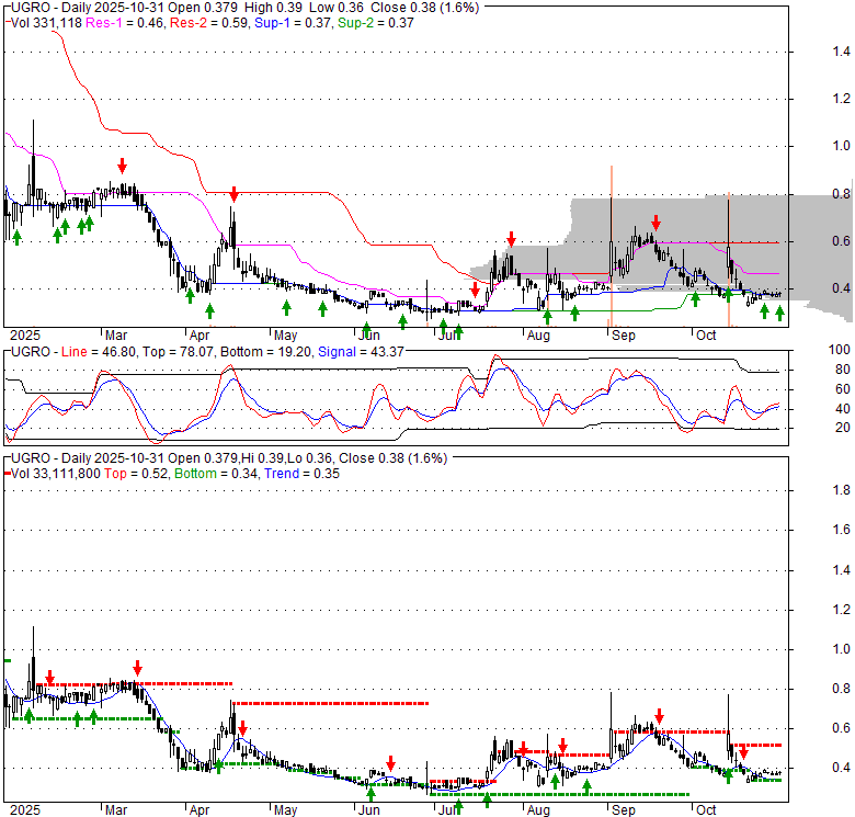 Price has closed above its short-term moving average. Short-term moving average is currently below mid-term; and below long-term moving average. From the relationship between price and moving averages: This stock is NEUTRAL in short-term; and NEUTRAL in mid-long term.[ UGRO ] has closed above bottom band by 42.5%. Bollinger Bands are 24.9% wider than normal. The current width of the bands does not suggest anything about the future direction or movement of prices.