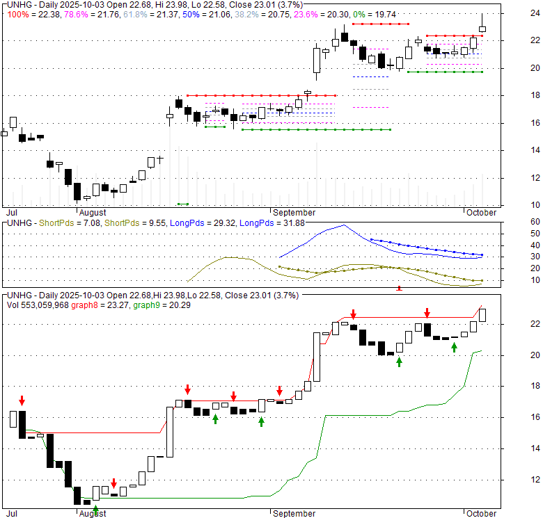 Price has closed above its short-term moving average. Short-term moving average is currently above mid-term; and below long-term moving average. From the relationship between price and moving averages: This stock is BULLISH in short-term; and NEUTRAL in mid-long term.[ UNHG ] has closed Bollinger Bands are 0% narrower than normal.