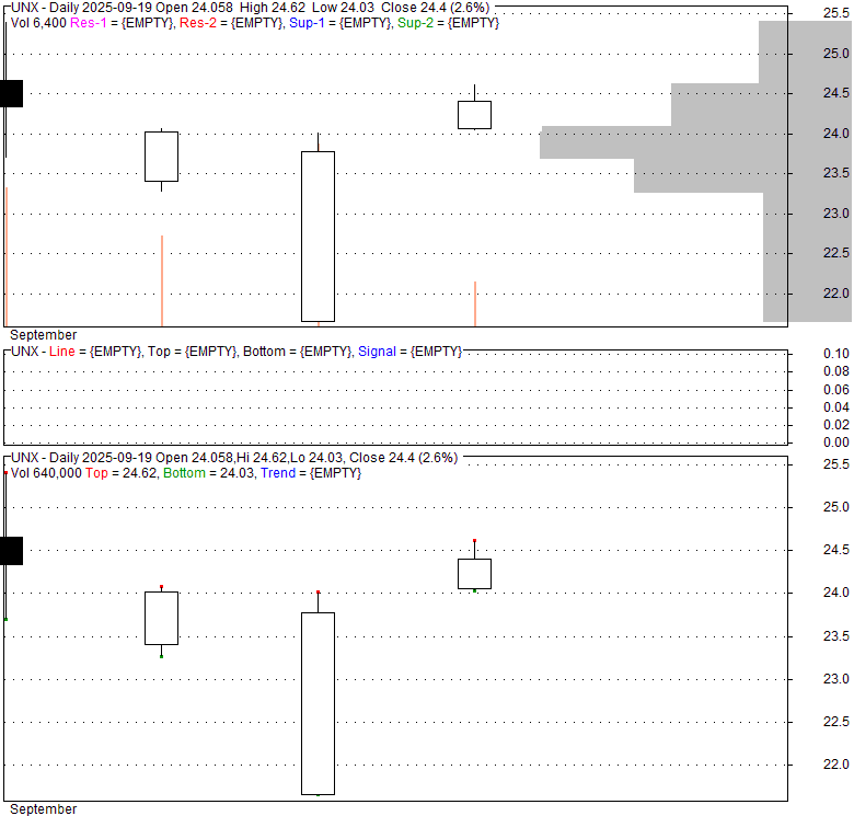 Price has closed below its short-term moving average. Short-term moving average is currently below mid-term; and below long-term moving average. From the relationship between price and moving averages: This stock is NEUTRAL in short-term; and NEUTRAL in mid-long term.[ UNX ] has closed Bollinger Bands are 0% narrower than normal.